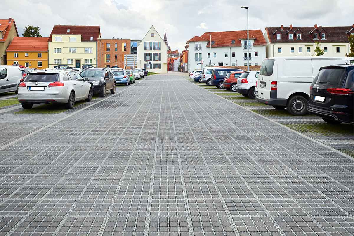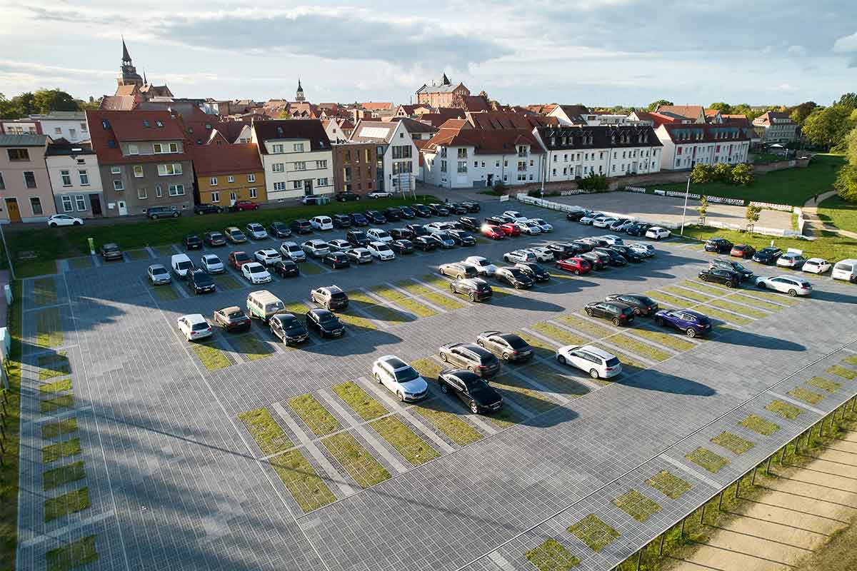 De nieuwe onverharde parkeerplaats en het festivalterrein in Güstrow kunnen flexibel worden gebruikt. Door verschillende kleuren TTE® bestrating te gebruiken, werden de afzonderlijke parkeerplaatsen van elkaar gescheiden.
