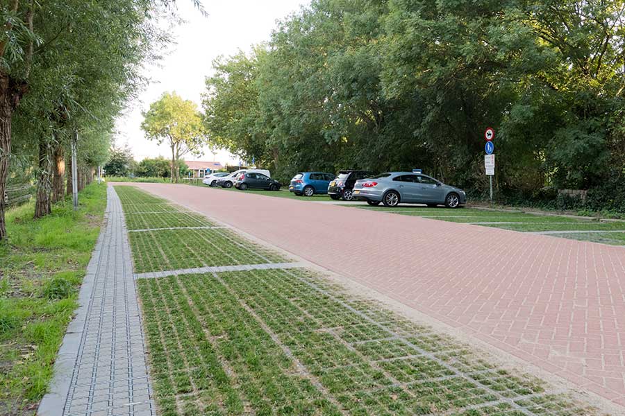 De parkeervakken zijn nu 100% waterdoorlatendheid, waardoor hemelwaterafvoer eigenlijk overbodig is. En er is aantoonbaar minder hittestress t.o.v. andere bestratingsmaterialen.
