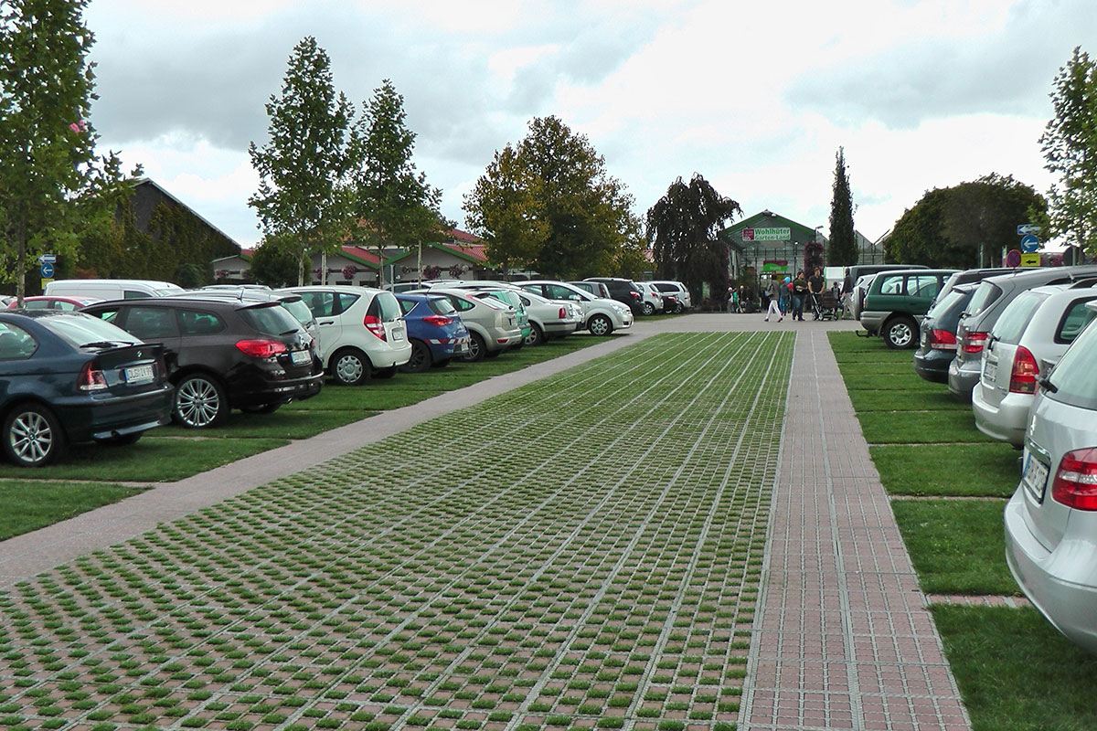 De familie Wohlhüter heeft voor de circa 550 m2 grote klantenparkeerplaats gekozen voor de groene variant van TTE®. Het project, dat in 2013 werd uitgevoerd, is niet alleen visueel indrukwekkend. Functioneel overtuigend zijn ook de verharde loopvlakken voor winkelwagens en het 50% groene rijpad.
